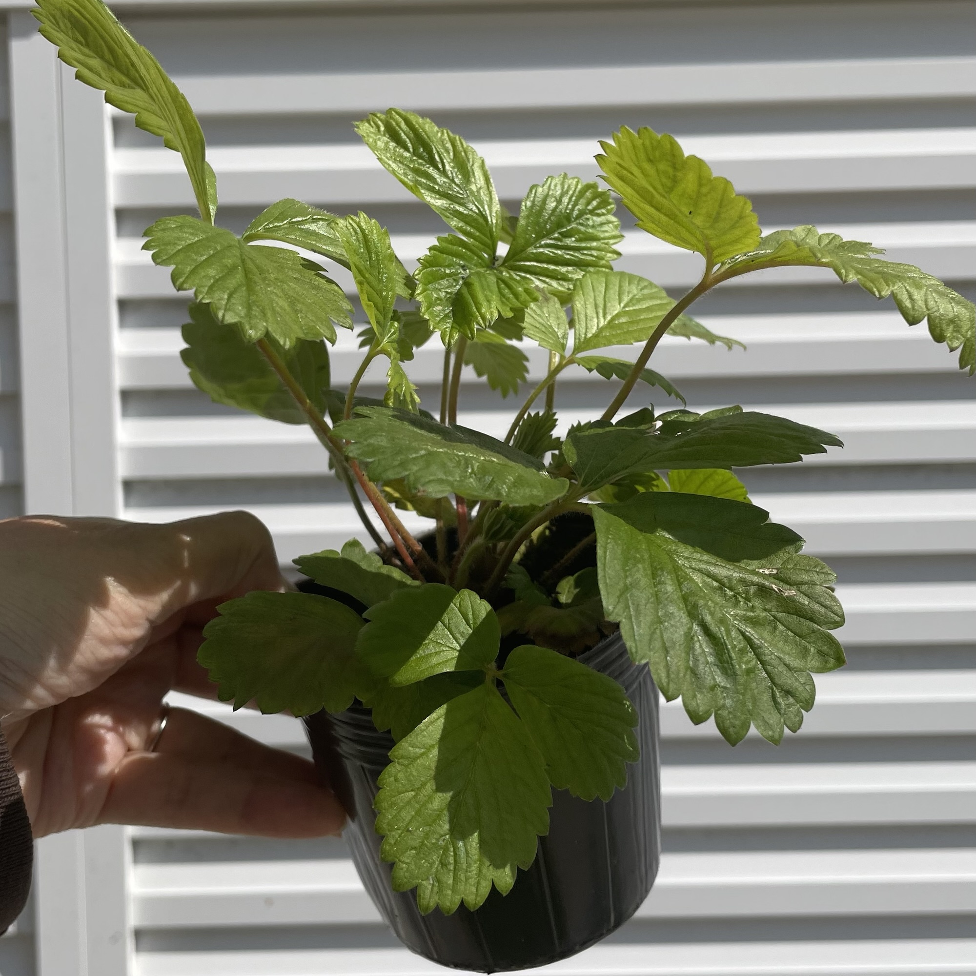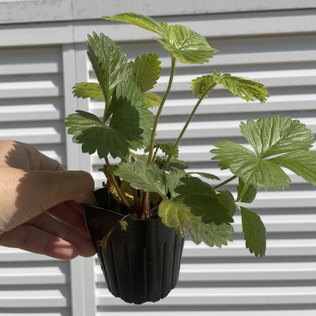 アルパインストロベリーのポット増し アルパインストロベリー 2026.03.12 しっかり育っているアルパインストロベリーですが、栄養不足&アブラムシで葉色がイマイチ。 ということで、根を伸ばせるように10cmポットに植え替え、牛乳スプレーしておきました☺️